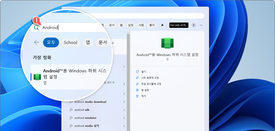 • ์๋์ฐ ์์ ๋ฉ๋ด์์ "Android" ๊ฒ์ → [Android™์ฉ Windows ํ์ ์์คํ